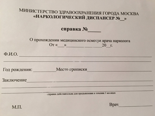 Мы предлагаем тем, у кого нет времени на хождение по врачам и сдачу анализов в наркологическом диспансере, купить справку в Москве, обратившись в наш центр. Независимо от места назначения, бланк будет изготовлен в соответствии со всеми действующими требованиями и заверен подписями практикующих специалистов и печатями настоящих медучреждений. Чтобы сделать заказ, вам надо только заполнить онлайн форму на нашем сайте, указав свои контактные данные. Наш менеджер перезвонит вам в ближайшее время, чтобы уточнить все детали и согласовать время и дату доставки готового документа. После этого вам останется только встретиться с курьером, чтобы забрать справку, убедиться в правильности ее заполнения и оплатить заказ. Доставка осуществляется в любой район Москвы.